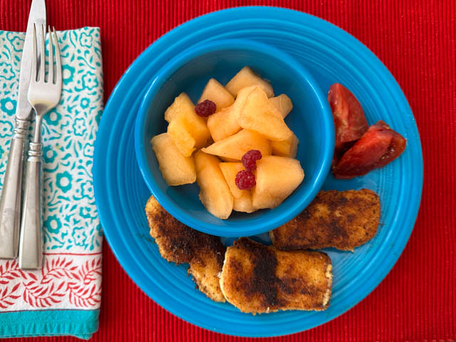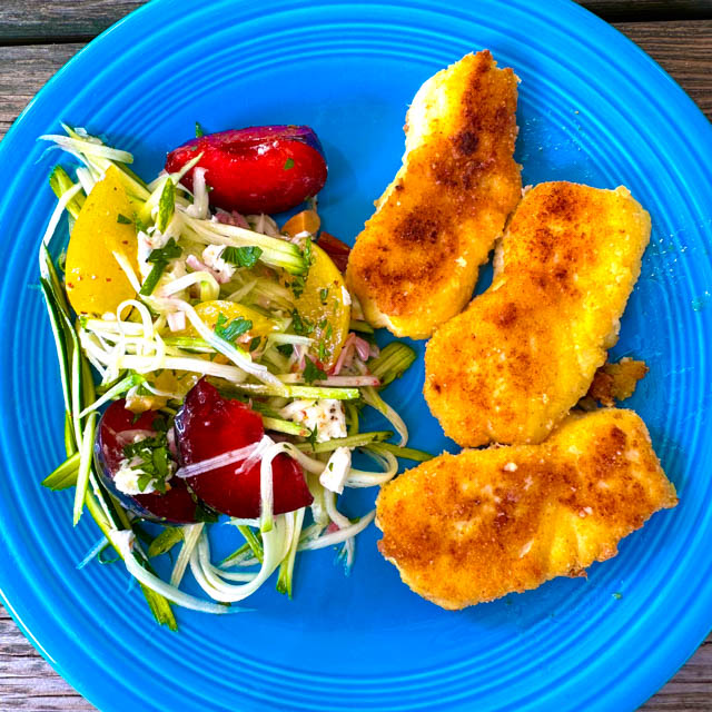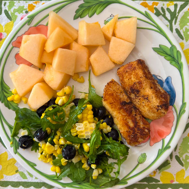 Almond crusted halibut with Crenshaw melon and Blueberry Corn Saladita