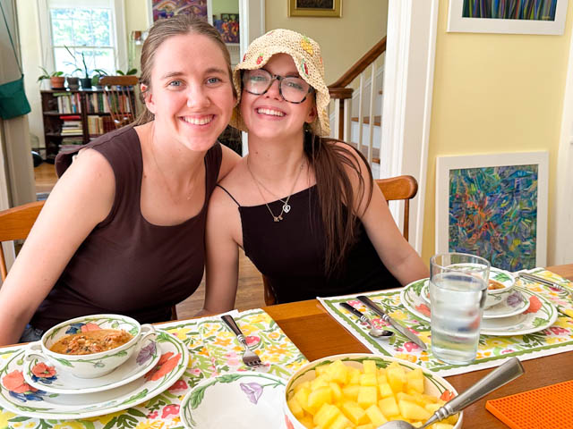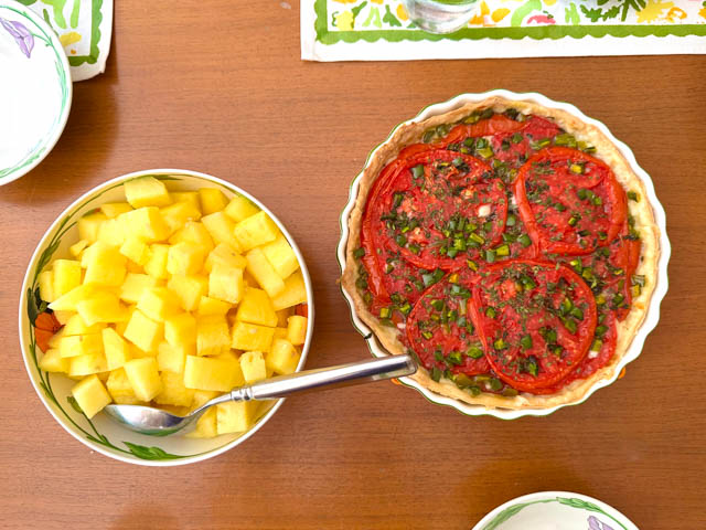 Cousins here for lunch: Shrimp soup with tomato tart and yellow watermelon