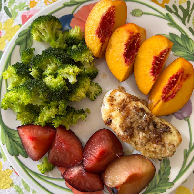 Parmesan Broiled Halibut with fruit and steamed broccoli