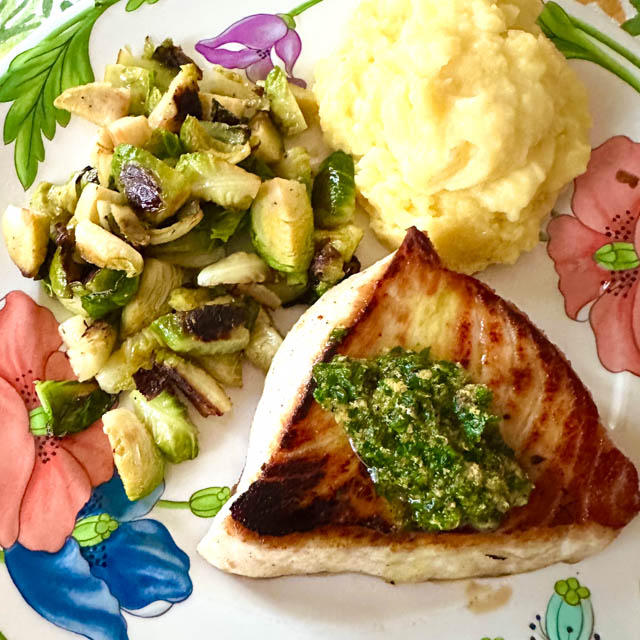 Swordfish with Herbed Lemon Pepper Butter Sauce, mashed potatoes, and Roasted Brussels Sprouts