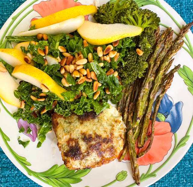 Broiled Halibut with Parmesan Crust with Kale Salad with Pear and Pine Nuts, steamed broccoli, and air-fried asparagus