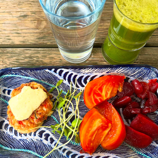Gluten Free Crab Cakes with tomato, plums, and fresh pressed green juice