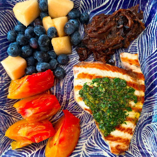 Grilled Swordfish with Fruit, Tomato, and Jammy Turkish Eggplant