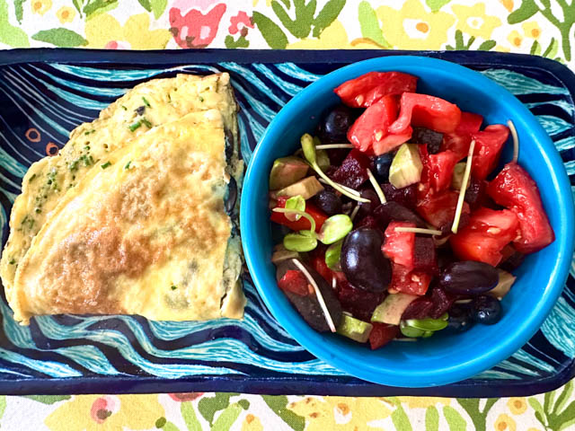 Mushroom boursin omelette with roasted beet, fruit, and tomato salad