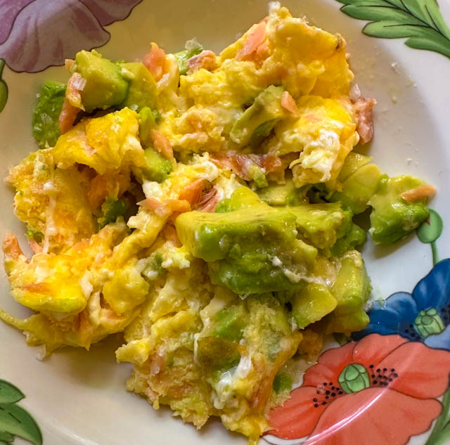 Scrambled eggs with kippered salmon, cream cheese, and avocado