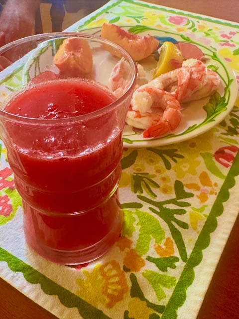 Fresh pressed homegrown tomato juice, with shrimp cocktail and peach