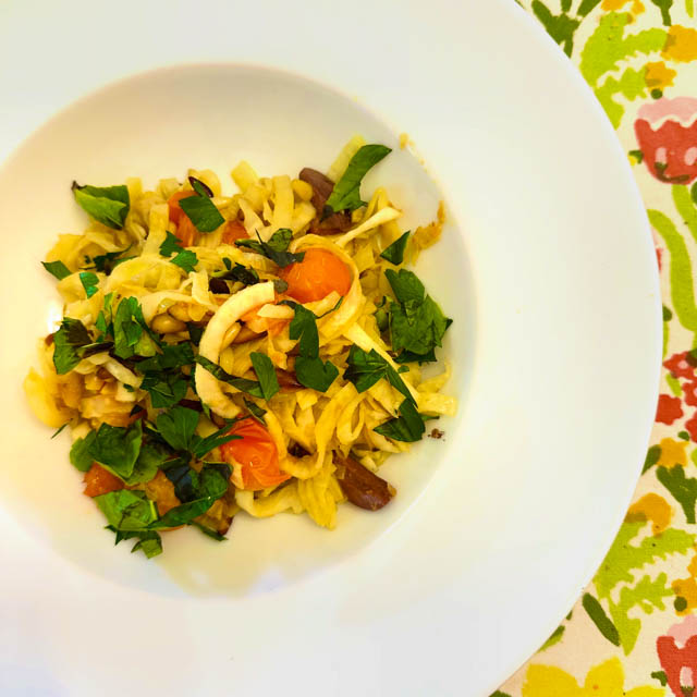 Spiralized Celeriac with Tomatoes Olives and Herbs
