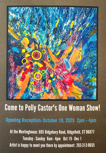 You are invited to come to my new One Woman Show, which is being held October 19 through December 1, at the Meetinghouse in Ridgefield, Connecticut.