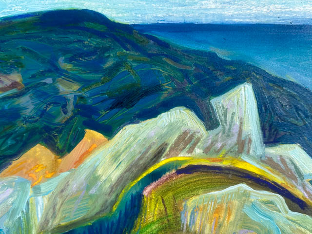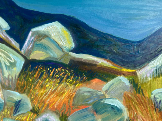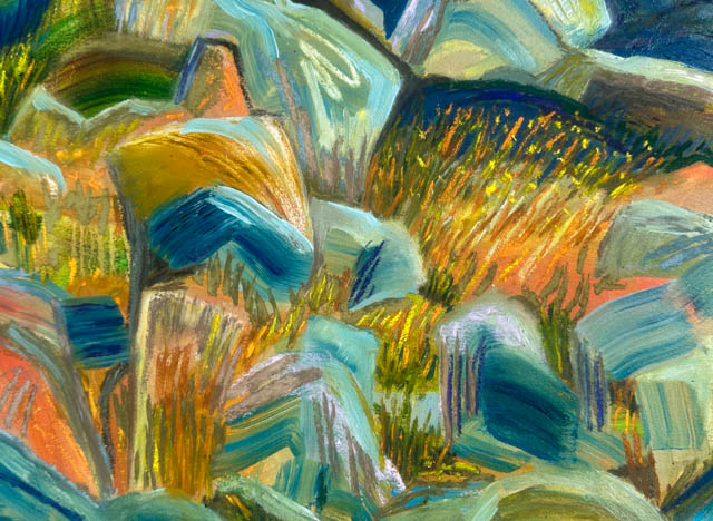 I’m calling this Rocky Knoll, and it is 22″x30″ and done on Arches oil paper. You can see the entire painting above and close up details below.