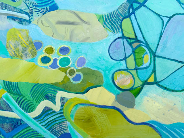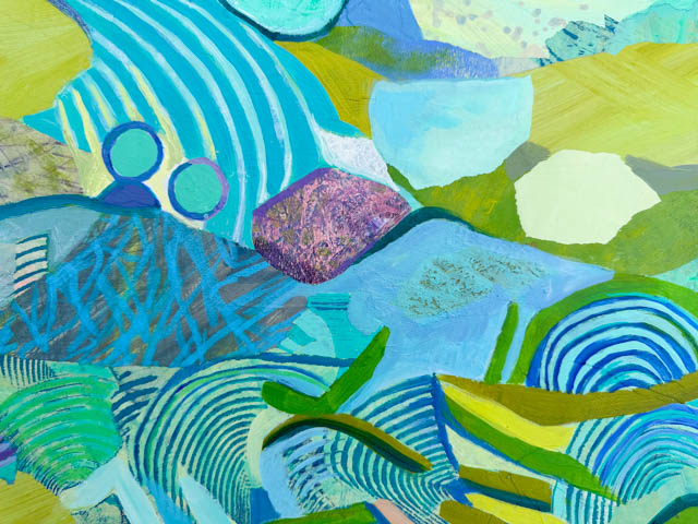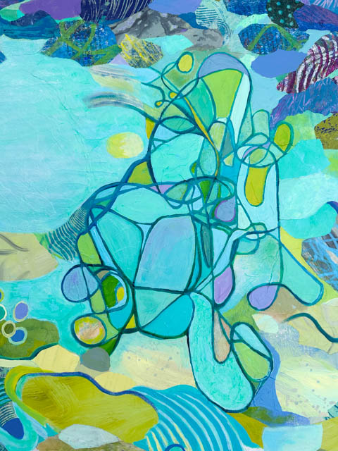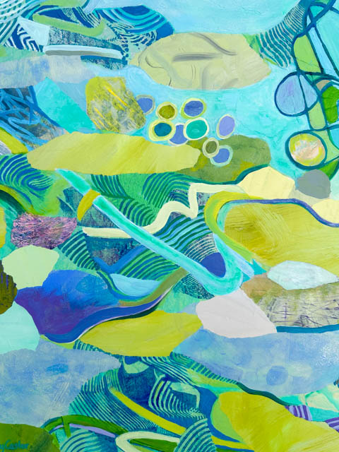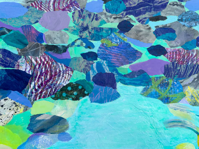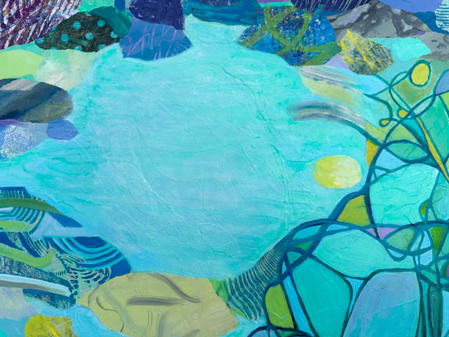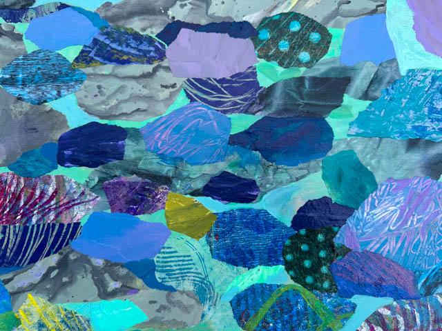 This monoprint collage of the Thriving Pond took a while to tweak into full harmony and a complete sense of thrumming with life!