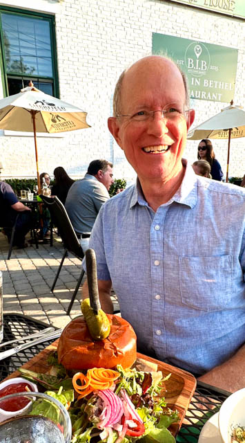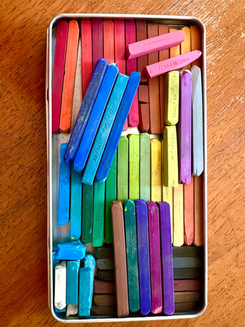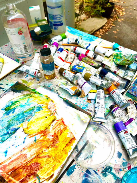 - I’m grateful for new cookbooks from the library, for fountain pens, converters, and ink, for handmade table runners given as thank you gifts, for our daughter jam session group, for our bathroom light getting fixed, for our new Turkish rugs, for friends visiting, for Facetime keeping us connected with our daughters, for new oil paint in stick form, for our sweet small town, for sunsets out my office window, for pumpkins with good stems, for chestnuts fallen underfoot, for homemade jam, for painting outside in my makeshift setup in the driveway, for cool cars and cool vanity plates, for our younger daughter’s new dulcimer, for the fact that my husband and I play cribbage most nights after dinner, for my nephew’s wife taking a glamour shot of herself on her recent birthday, for friends at No Kings rallies, for a new journal, for sculpture gardens, for gelli plates, for our Savory Tuna Burgers, for my office/studio space, for water reflections, for flowers, for my new metal box for my Conte crayons, for joyously anticipating a winter going nowhere, and for work I love.