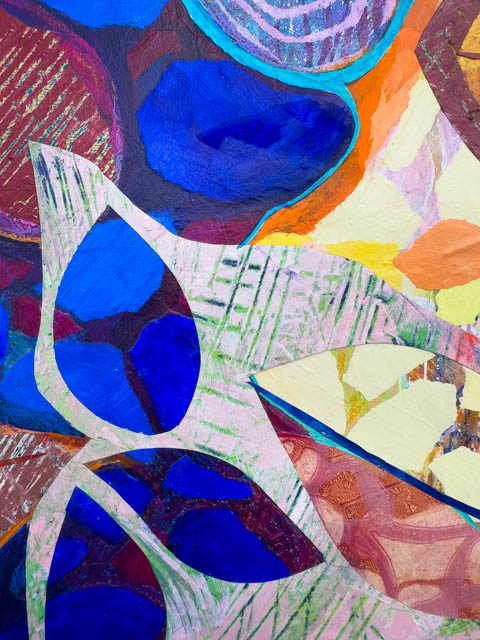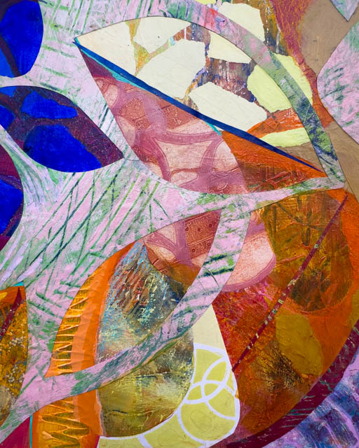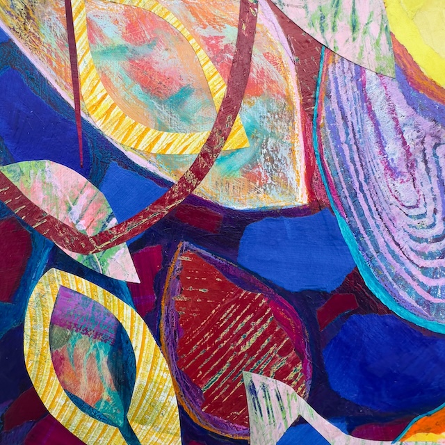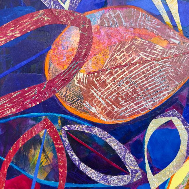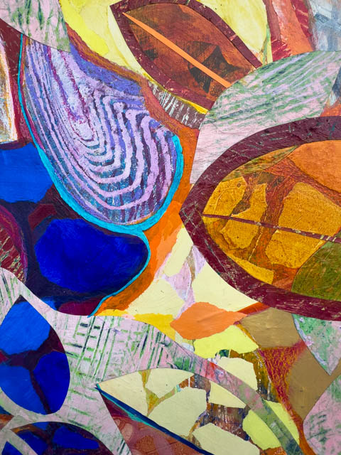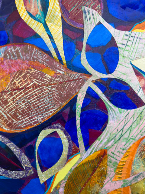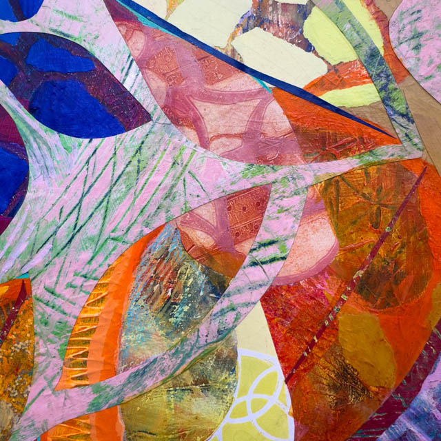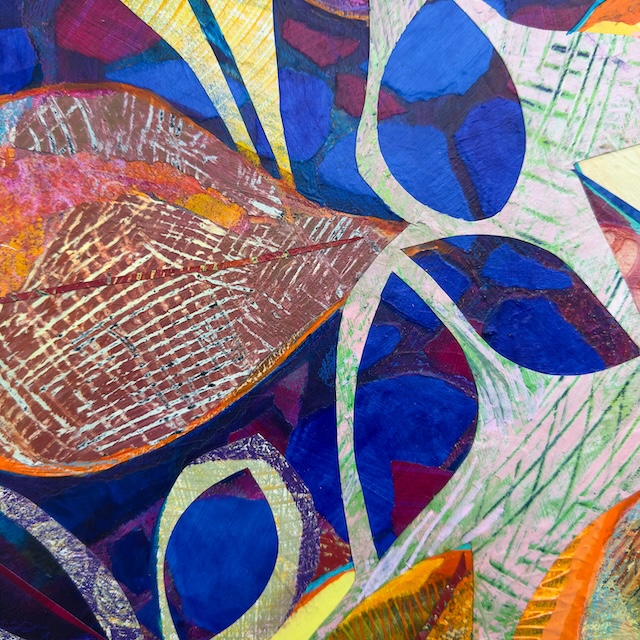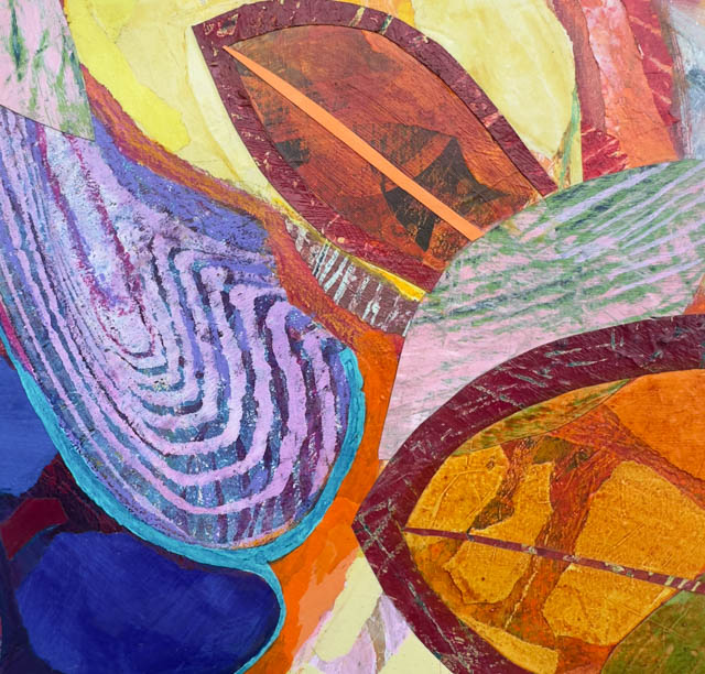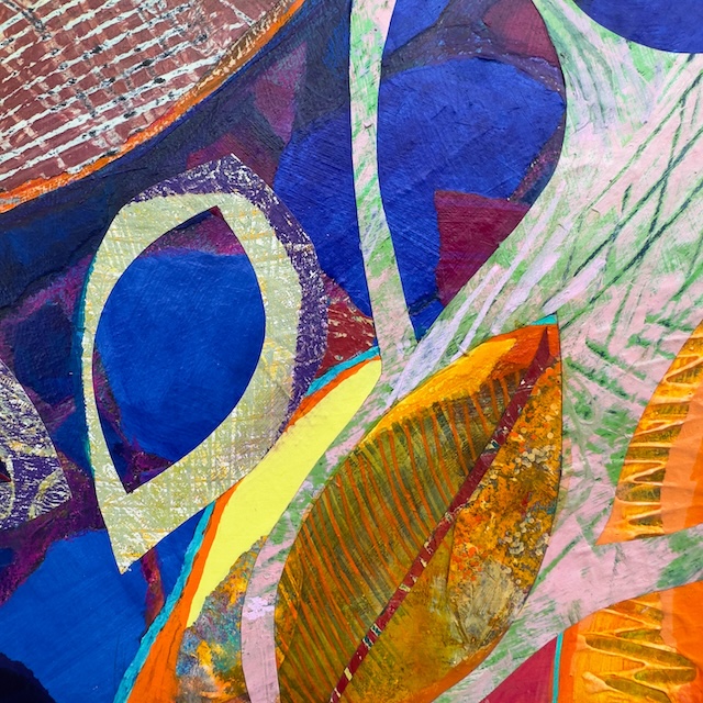 This collage of hand painted and hand printed papers is 20″x20″ and done on a wood panel. See the entire work above and close-up photos below.