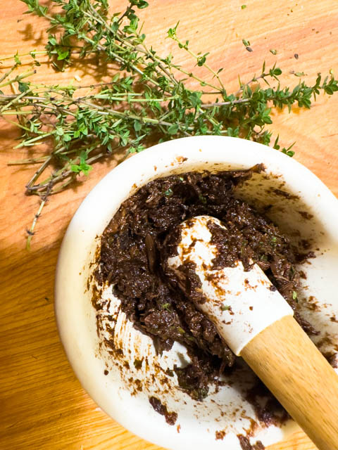 Meanwhile crush the caraway seeds in a mortar and pestle. Add the black garlic and thyme and crush them into a rough paste.