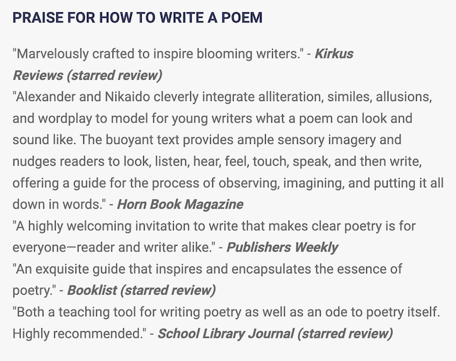 I recently bought this children’s book, How to Write a Poem, for someone on my gift list, and was so excited by it, I thought you needed to know about it as well, for the young people in your life.