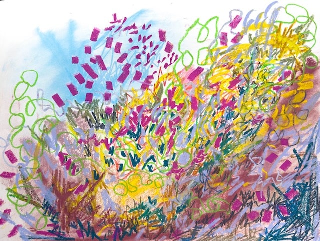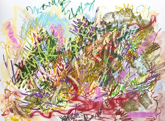 These are all 18″x24″ and abstracted from the fall landscape here. They are done in oil pastel, soft pastel, Caran D’Ashe crayon, and gouache (used straight from the tube with no brush), done on drawing paper. I got into putting down gooey gouache and oil pastel and then going over it with soft pastels which stuck into it so nicely.