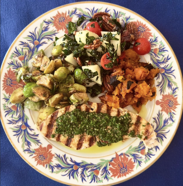 We had a wonderful Thanksgiving meal of Swordfish with Lemon Pepper Herb Butter, Kale Pear Salad, Brussels Sprouts with Black Garlic, Caramelized Butternut Squash, and pumpkin pie. You can see all this in photos below, as well as some of the other food we enjoyed as treats on the holiday weekend, complete with recipe links below each photo.