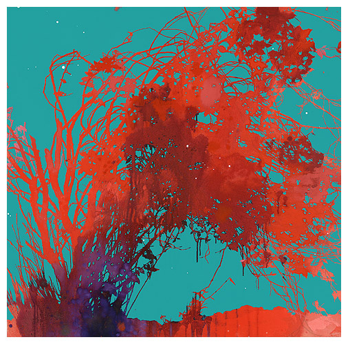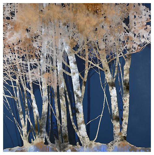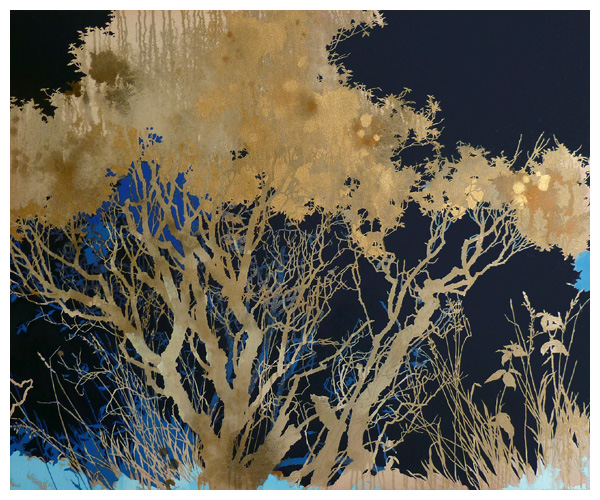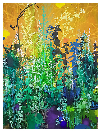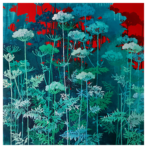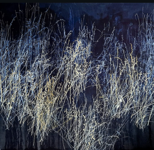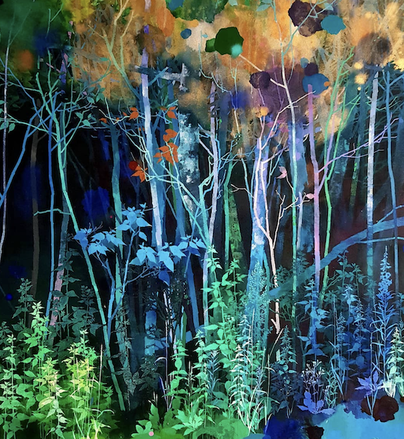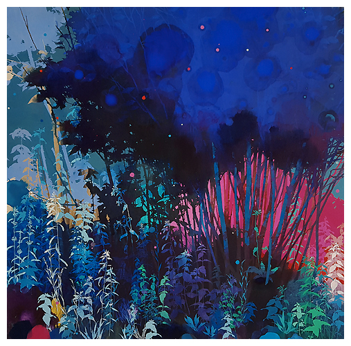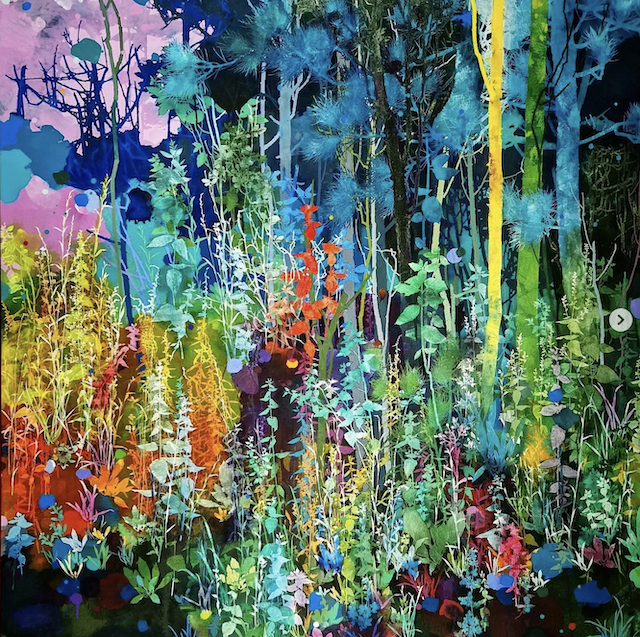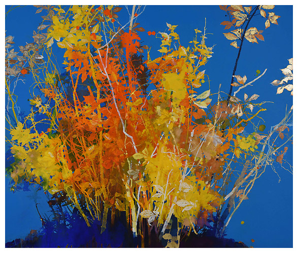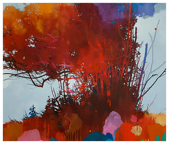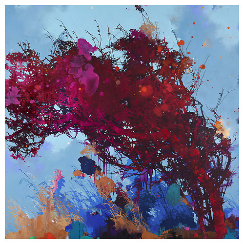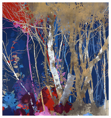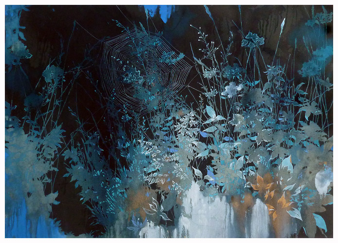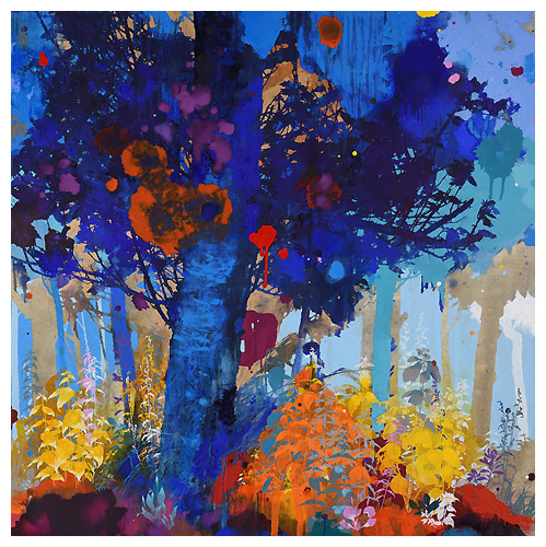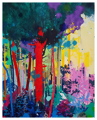 The artist says he finds “that the application of paint, especially when poured or thrown at the canvas gives the drawn lines an important contrast.” Like the subject matter, he allows the image to ‘grow’ on the canvas, evolving through the layers, with his process, as is changes all the time. It works for me!