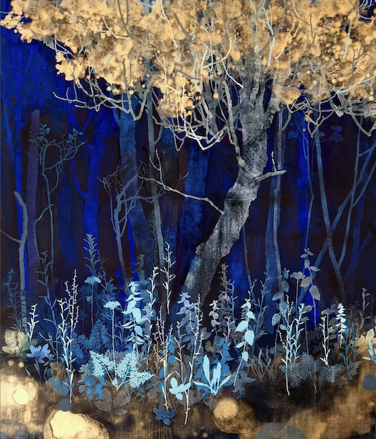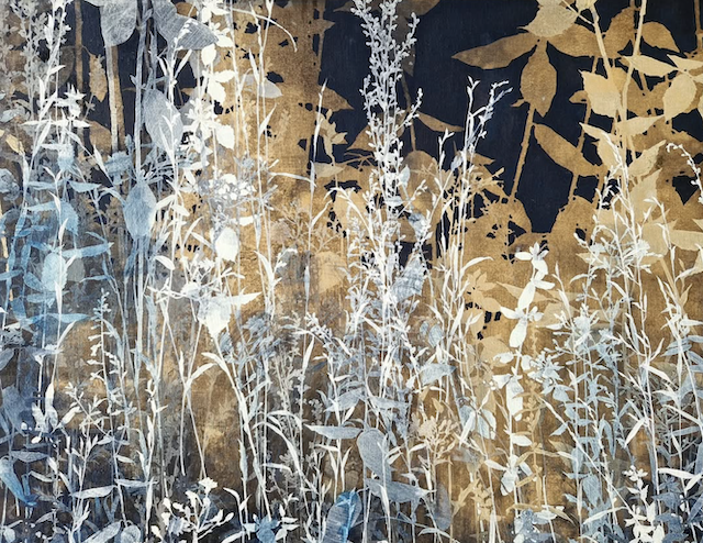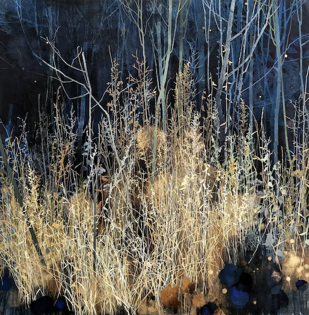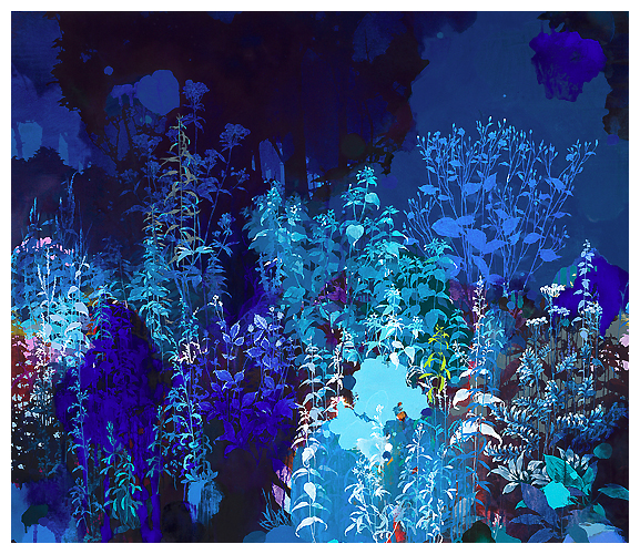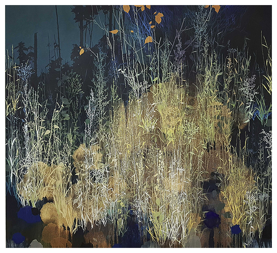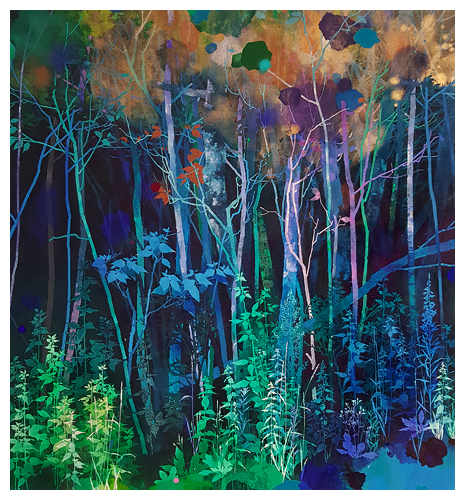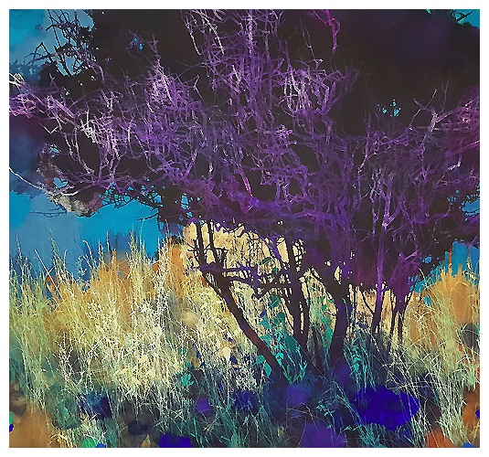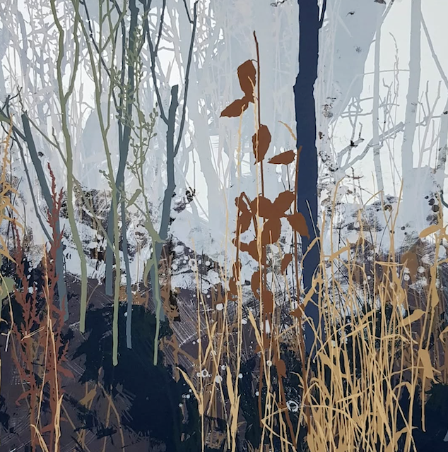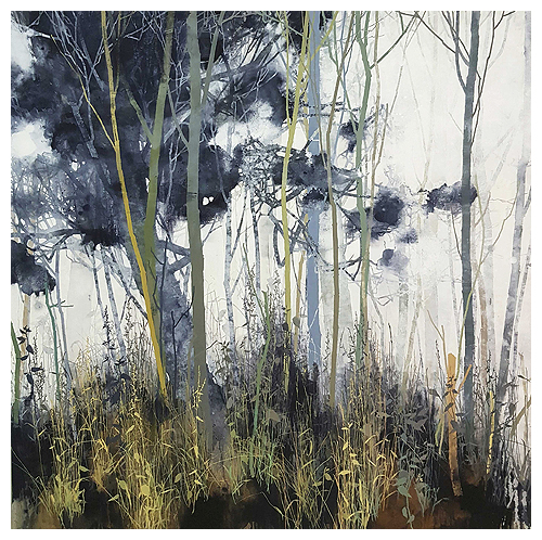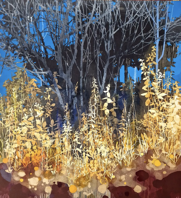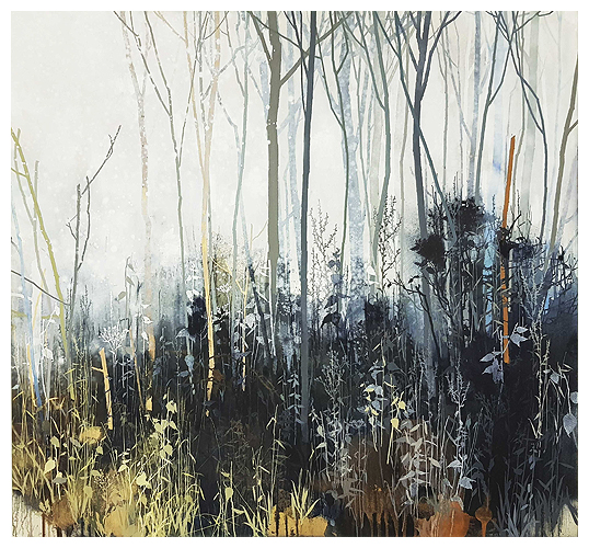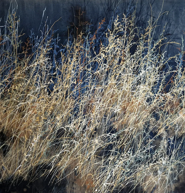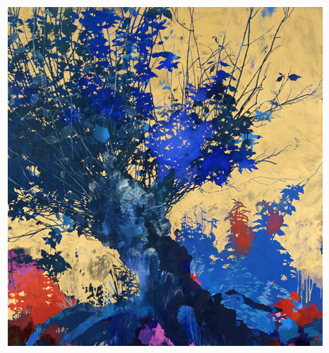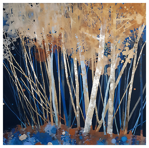 The artist says he finds “that the application of paint, especially when poured or thrown at the canvas gives the drawn lines an important contrast.” Like the subject matter, he allows the image to ‘grow’ on the canvas, evolving through the layers, with his process, as is changes all the time. It works for me!