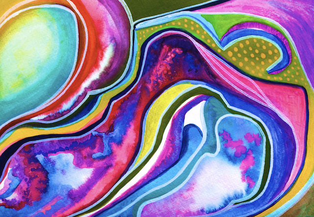 the colors drifting, curling. Outside
