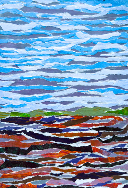Contrariwise, however, it is just as valid to embrace the white-edged bits for their stand out nature. So in these three sketchbook (artist journal) pages, I decided to lean into utilizing the white-edged rips as a distinct design element, and I’m really liking the result. Doesn’t the one above look like snow on twigs? In the bottom one, I played with possibilities of waves and sky with the white edges, although I’m not sure that one is finished yet. Is it crying out to become a base for an abstraction, or should I lean into the landscape action and get some larger clouds coming toward us from above?