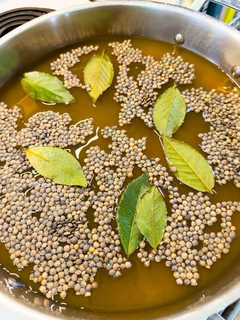 Remove the bay leaves and drain the lentils, reserving the liquid. You should have 4.5 cups; if not add water to that amount.