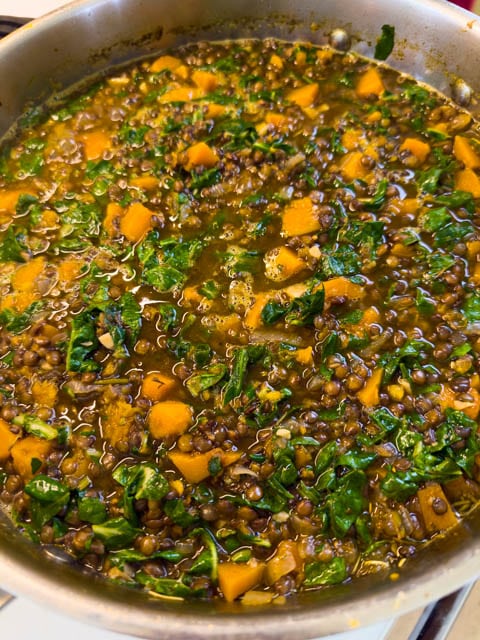 Add the butternut squash and reserved lentil liquid, raising heat to bring to a boil, then cover the pot and reduce to a simmer for 10 minutes.