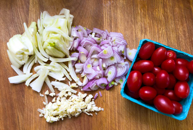 Melt the butter in a skillet and add the shallot, fennel, and garlic. Stir and cook until softened, about 4 minutes.