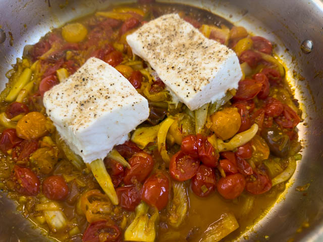 Add the fish filets, nestling them on top of the tomatoes. Season each one with salt and pepper. Reduce heat to medium low and cover. Let cook for 6-10 minutes until fish is opaque. (The timing will depend of the size of your filet and your stovetop.)