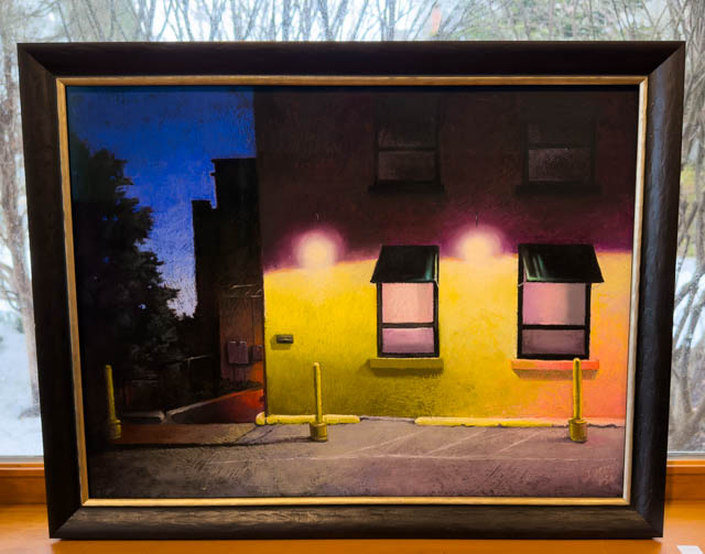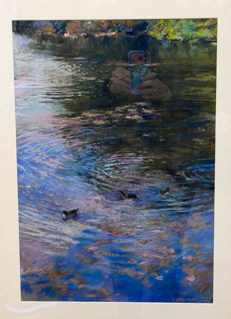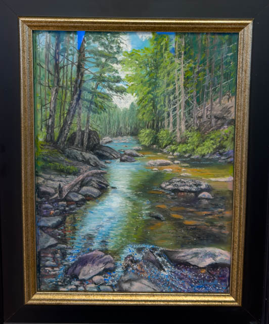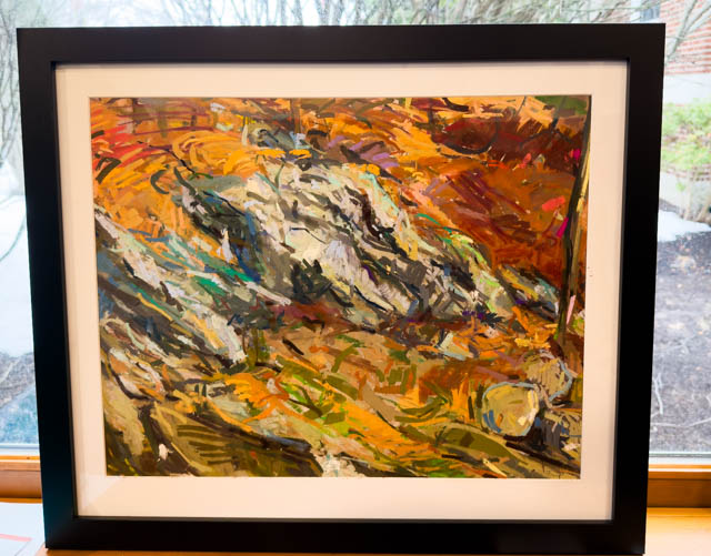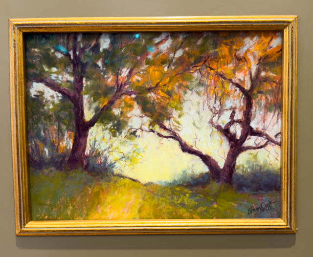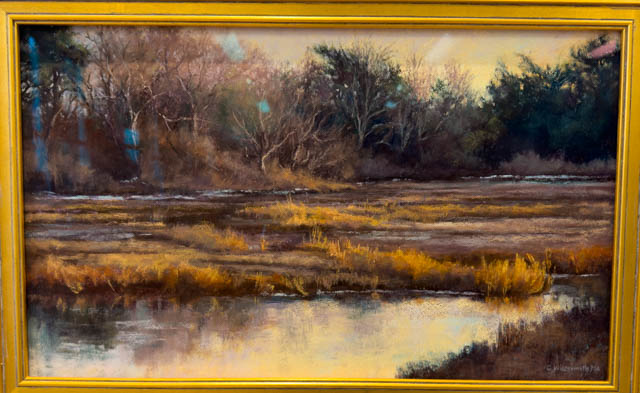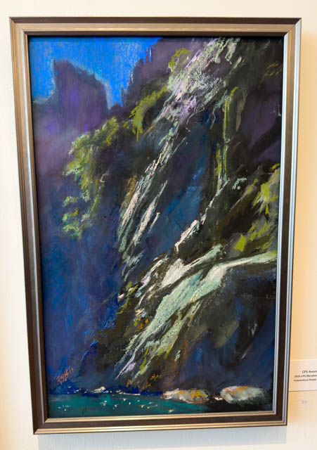 My painting The Comforts of Pure Love is in the current Connecticut Pastel Society Member’s show in Southington at SOCCA. My painting got great placement in the middle double window of the show. There was a good crowd at the opening and it was fun to catch up with friends I hadn’t seen in a while. My husband made his Pecan Sandies (recipe here) which were raved about by everyone. In this post you can see my favorites in the show. I particularly like the two abstracted rock paintings. I apologize for any reflection in the glass in these photos. The show is up until April 10, if you can stop by to see it.