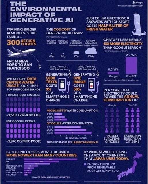 • Not only creating more pollution and more global warming, it creates a cycle that results in less energy and water for more important things, like food and drinking water. For example, the Colorado river only now has 57% less water in it than usual because of less snow in Colorado and Montana, and provides water to 40 million Americans; billionaire tech companies are buying water rights (Just ChatGBT to the tune of 39 billion gallons of water daily) and get priority over towns, who were already running short before, and the situation will only compound as more people use AI.