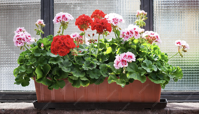 and the blossoms of the geranium at the window.