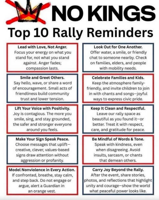 No Kings rallies are being held in America today, to come together in unified opposition against immorality and unconstitutionality in our government. This is important to help stop our democracy from being turned into a dictatorship by corrupt oligarchs.