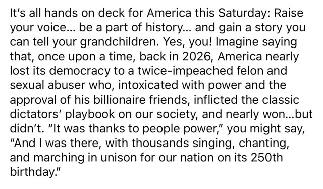 As the the president of our local clergy association, I was asked to give the keynote speech at our No Kings rally here, but then as the expected numbers of attendees swelled to 30,000, the town insurance people started freaking out and cancelled the planned event. Now people will be demonstrating here ad hoc, and I will not be giving my speech. I already wrote half of that speech, and feel compelled to stress that people need to do what they can to turn this moral, tragic, corrupt, and illegal situation around.