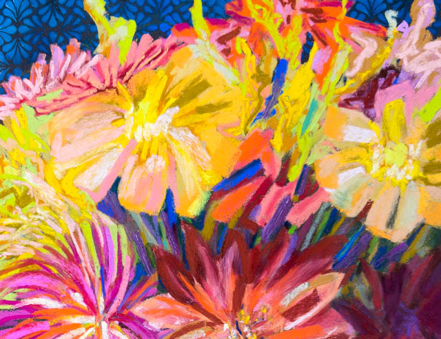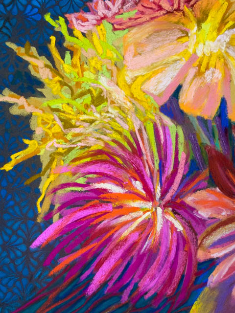 So the March the challenge was to paint a still life with a pattern in it. In this post you can see the one I did that was shared yesterday. It is 19″x25″ and done in pastel. I had fun doing it– especially the technical background, which was good practice for me, so I can apply that technique to something more abstract.