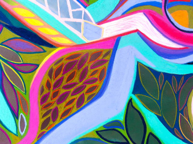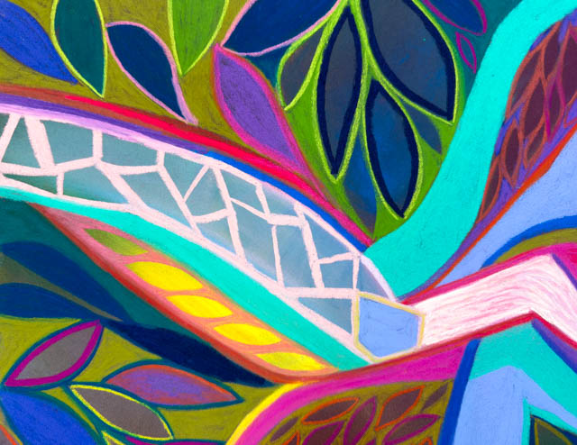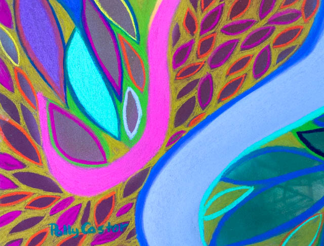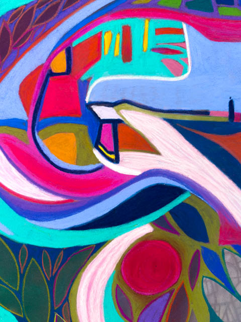 The idea for this painting germinated from the intro to a favorite show All Creatures Great and Small, which traverses winding, hilly roads toward town and home. Here too in Connecticut roads are undulating and indirect, surrounded too by foliage and fields, and there are many ways to get to the same place. It was fun to finally paint this abstract idea.