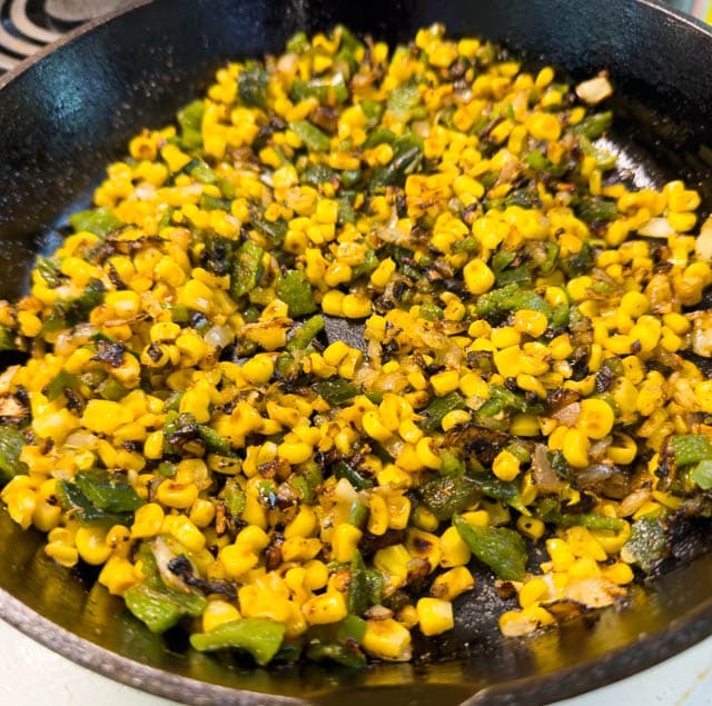 While the poblanos are in the broiler, add the corn kernels to a dry, heavy-bottomed pot over medium high heat. Stir regularly, until the corn is brown and beginning to blister. Remove from the pot and set aside.