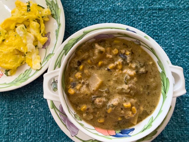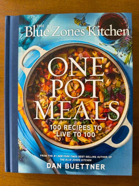 This is satisfyingly delicious, and since I got the recipe from the Blue Zone Kitchen Cookbook shown below from folks who live to over 100, I can say it’s healthy too. We’re past a hot flash of spring here, back to chilly temperatures, so this was really welcome. However, I look forward to making it in the summer two when the fresh corn, poblanos, and potatoes are at the farmer’s market.